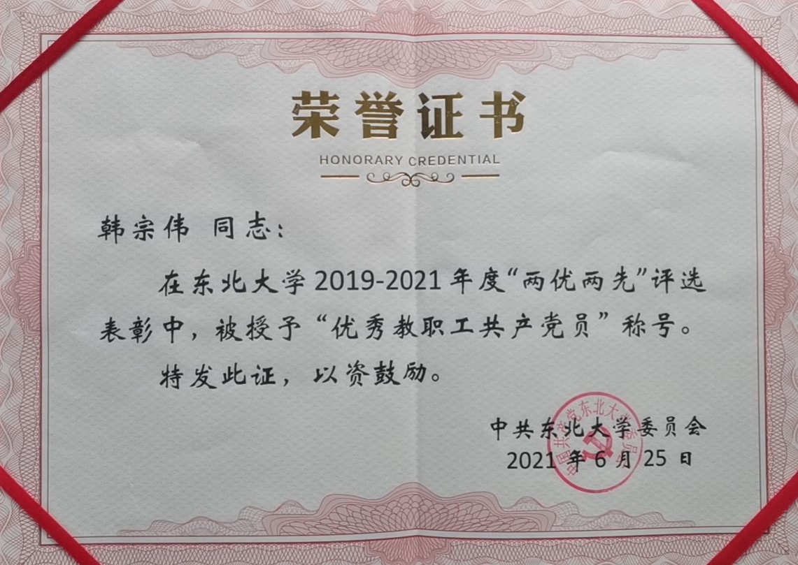 2019-2021年度东北大学优秀教职工共产党员