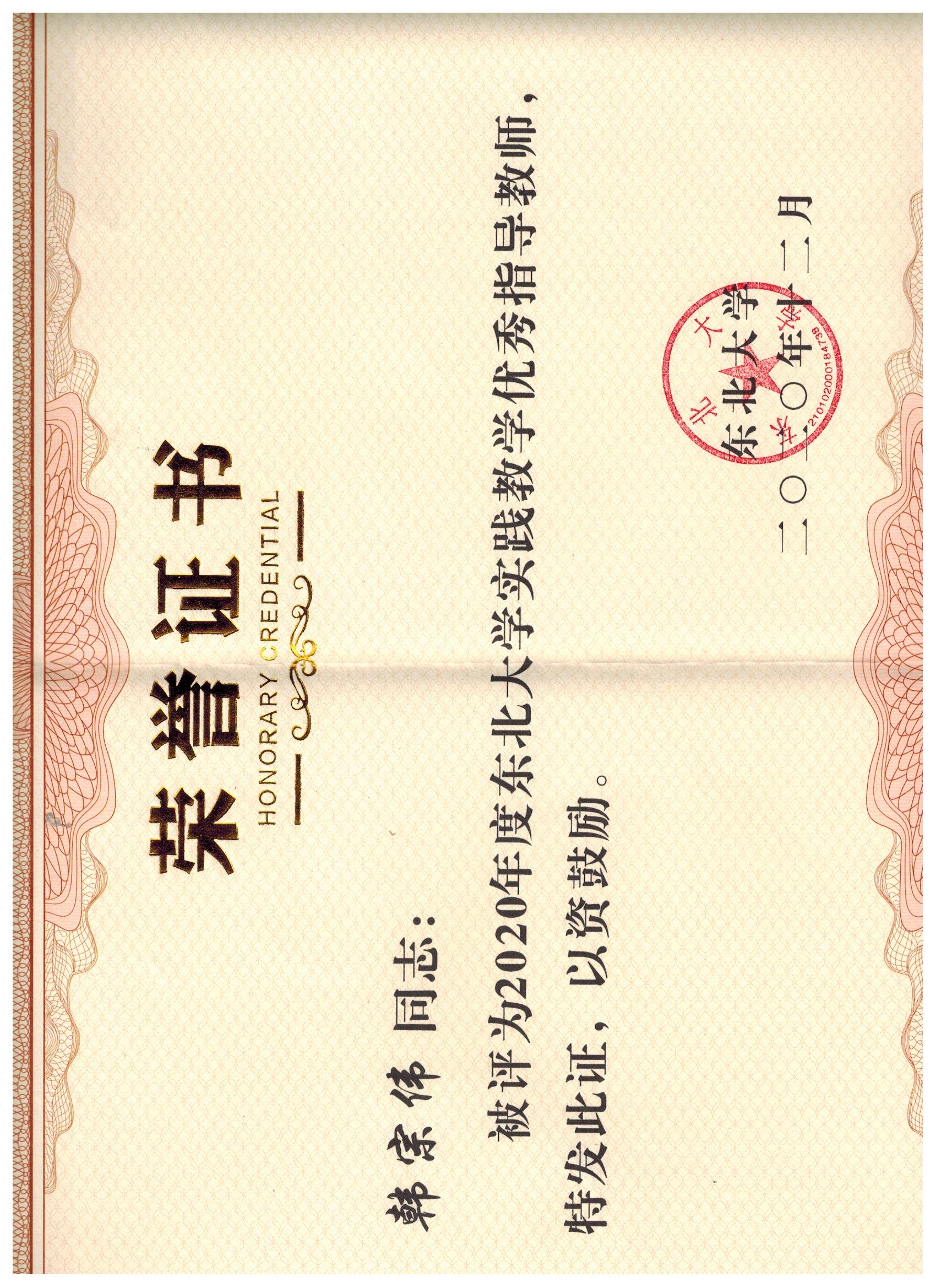 2020年度东北大学实践教学优秀指导教师